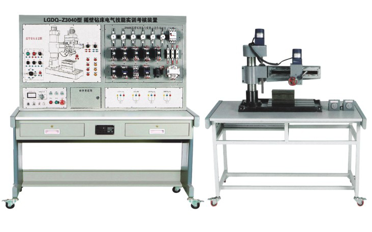 TYK-Z3040 搖臂鉆床電氣技能實訓考核裝置(半實物)由電源控制部分、機床電氣控制部分、半仿真機床實物部分構成。電源控制部分包括實訓定時、定時報警、安全用電自動控制等,機床電氣控制部分把整臺機床內部電器裝在正面面板上,能直觀地觀察機床工作時各電器的動作狀況。故障點在面板上設有相應測試點,供實訓考核者測試用。仿真機床部分能模擬機床各種運動。通過TYK-Z3040 搖臂鉆床電氣技能實訓考核裝置的實訓能使學員掌握機床常見故障的現(xiàn)象、故障產生的大概部位,熟練掌握機床電路工作原理,其是維修電工初、中、高級技能鑒定的理想的實訓考核設備。