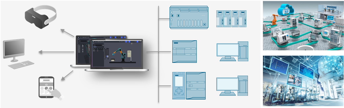 TYK-TVP01型 數(shù)字孿生系統(tǒng)能夠從虛擬機(jī)械設(shè)計(jì)、虛擬電氣接線再到虛實(shí)互動(dòng)編程,虛擬調(diào)試以及集成調(diào)試的整個(gè)過程,同時(shí)配置XR互動(dòng)仿真,能夠?qū)崿F(xiàn)多人協(xié)作的沉浸式應(yīng)用,TVP系統(tǒng)具有多種仿真和組合方式,支持半實(shí)物、全虛擬、以及3D互動(dòng)的編程方式。