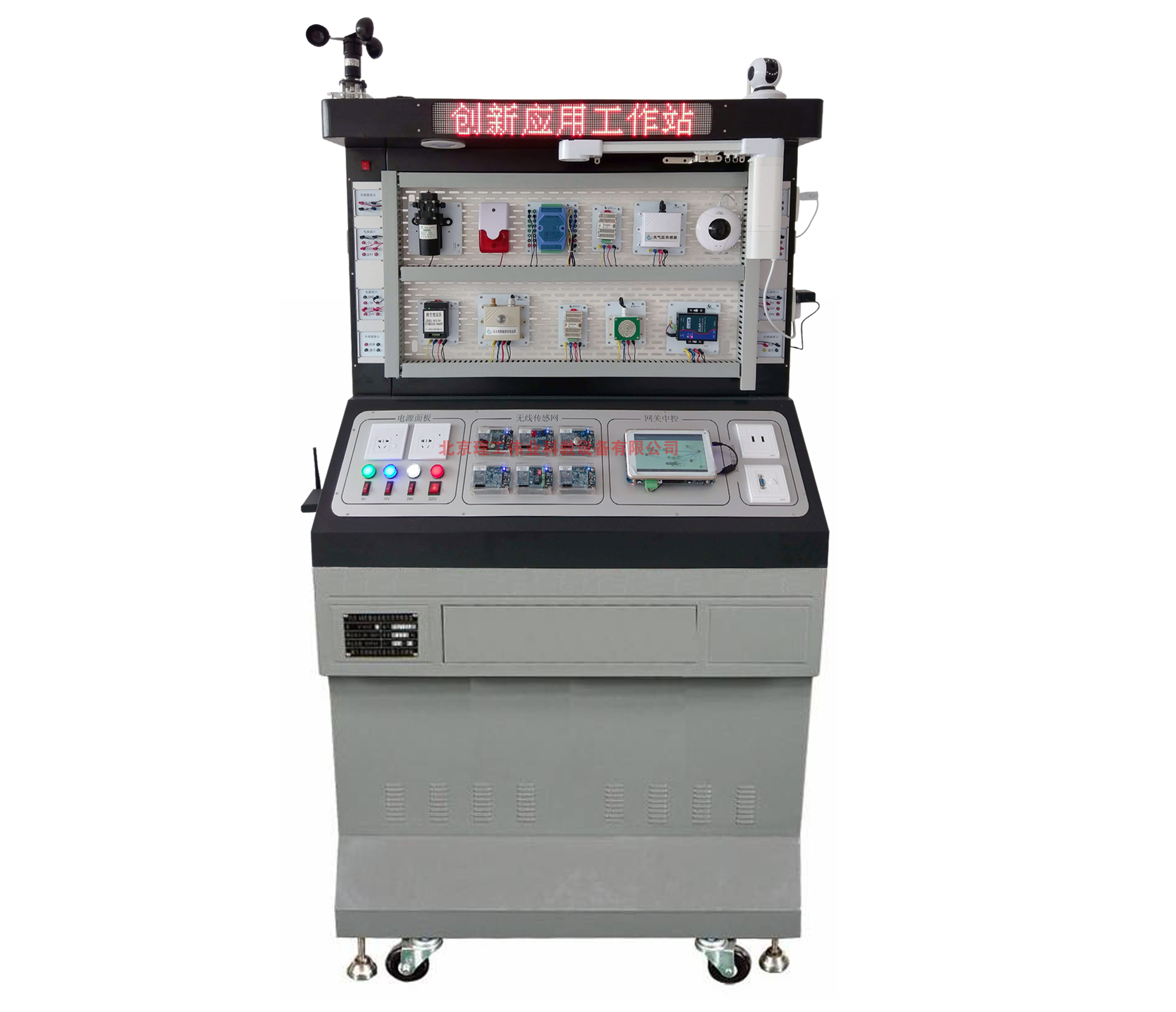 1. 標配網(wǎng)孔操作板、四組供電接口、四組有線傳感器的電源通信接口、六個無線傳感節(jié)點的供電接口、網(wǎng)關(guān)供電接口、兩個強電控制插座、各類電源帶燈按鈕、大屏點陣顯示屏等,為創(chuàng)新創(chuàng)意應用場景提供支持。