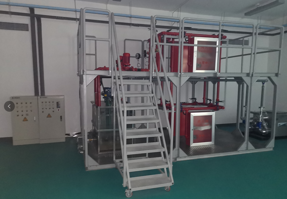 消防給水系統(tǒng)主要有給水箱、噴淋泵、穩(wěn)壓罐、濕式報警閥、壓力開關(guān)、水流指示器、消防給水管道、閉式噴淋頭等組成。管路采用鍍鋅管進行設計,可進行鍍鋅管的切割、套絲、安裝和通水試驗操作,通過控制系統(tǒng)可實現(xiàn)噴淋滅火功能,消防噴淋泵采用雙泵互備切換功能;并可與消防控制中心聯(lián)接控制。