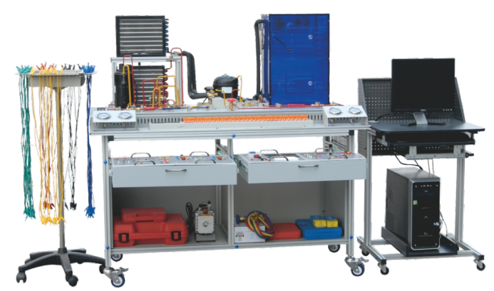 本裝置主要由制冷系統(tǒng)、電氣控制模塊及智能考核系統(tǒng)三部分組成。制冷系統(tǒng)分為分體式熱泵空調(diào)和直冷電冰箱,涵蓋了制冷專業(yè)中所涉及的安裝、管路設(shè)計(jì)焊接技術(shù)、接線、保壓、檢漏、抽真空、充注制冷劑、制冷劑回收等內(nèi)容。電氣控制模塊中分體空調(diào)有制冷、制熱、除濕、自動(dòng)的工作模式,直冷冰箱有標(biāo)準(zhǔn)、節(jié)能、速凍的工作模式,配套智能考核系統(tǒng)能夠更好的掌握控制電路基本原理及維修技術(shù)。