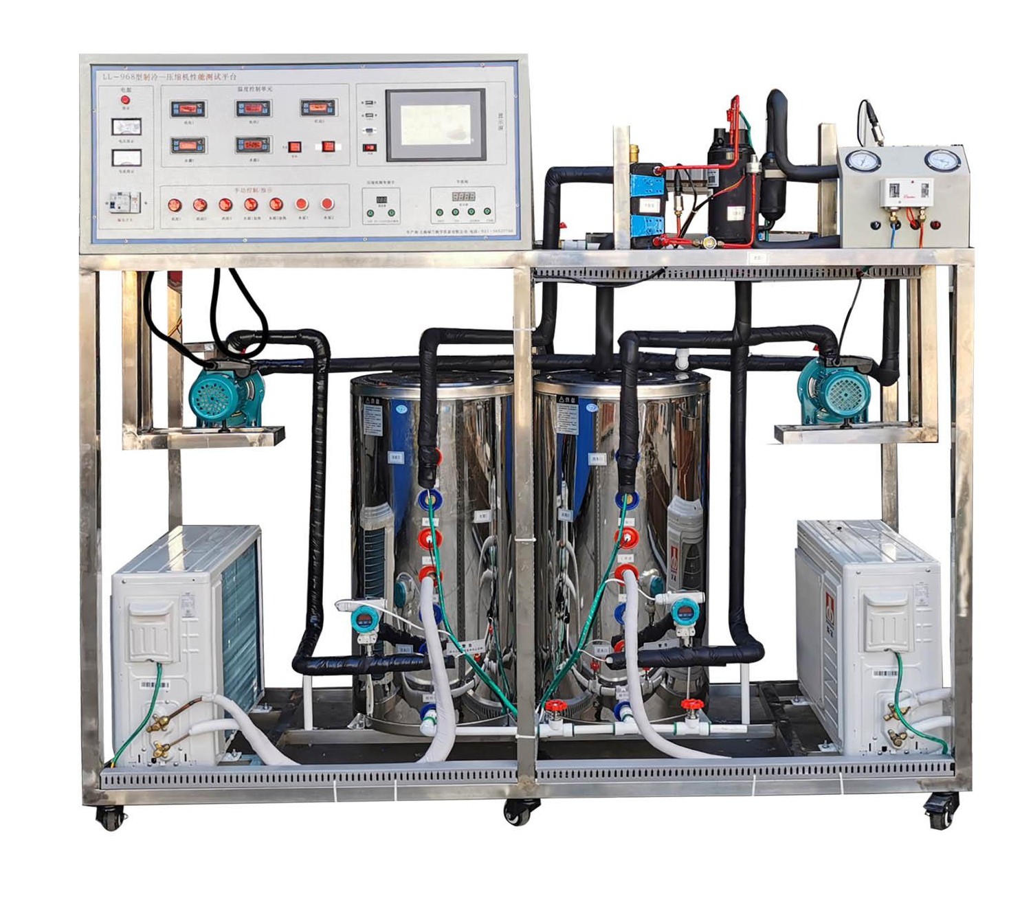 TYK-RB01型 熱泵-壓縮機性能實驗系統(tǒng)采用熱平衡法測量熱泵與制冷壓縮機的性能。系統(tǒng)主要由制冷壓縮機、蒸發(fā)器、冷凝器、恒溫水箱和電子膨脹閥等組成。采用傳感器和檢測儀表采集蒸汽壓縮式制冷循環(huán)過程中的溫度、壓力、流量、壓縮機功率、電流、頻率等狀態(tài)參數(shù),經(jīng)自行研制的數(shù)據(jù)采集板卡連接到計算機,基于面向?qū)ο蠹夹g(shù)開發(fā)的具有實時性高,界面設(shè)計人性化等特點的測控軟件實現(xiàn)熱力循環(huán)過程實時動態(tài)顯示、性能參數(shù)測試和計算,構(gòu)成具有檢測、分析、記錄、測試、繪圖等多功能一體化的熱泵-壓縮機性能實驗系統(tǒng)?;诨A(chǔ)型機組,增加如下內(nèi)容:學生設(shè)計型與創(chuàng)新型實驗。