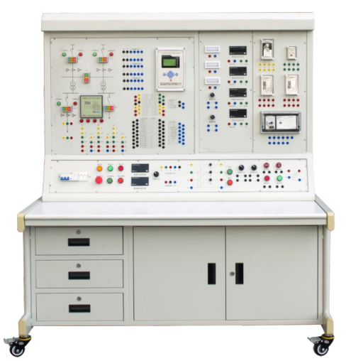 本裝置由實(shí)驗(yàn)臺,實(shí)驗(yàn)桌、實(shí)驗(yàn)?zāi)K、大功率三相自耦調(diào)壓器四部份組成。本裝置的實(shí)驗(yàn)臺左側(cè)有10kV/0.4KV一次系統(tǒng)主接線面板,實(shí)驗(yàn)臺右側(cè)為實(shí)驗(yàn)?zāi)K掛放區(qū)、實(shí)驗(yàn)臺下側(cè)為電源實(shí)驗(yàn)臺。