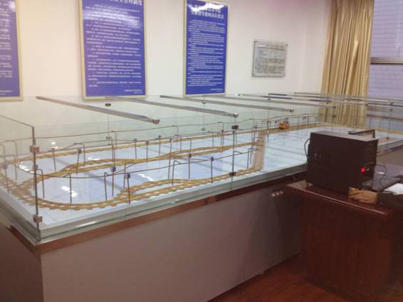 TYK -MXD04型 井底車場及電機(jī)車信、集、閉系統(tǒng)演示裝置能夠反映出井底車場主要巷道和主要硐室,井底車場與井筒、運(yùn)輸大巷的聯(lián)系及線路布置。能直觀演示信、集、閉系統(tǒng)的布置方式、程控、工作原理以及電機(jī)車在井底車場運(yùn)行方式,可對道岔進(jìn)行控制。系統(tǒng)采用微計算機(jī)或PLC控制。