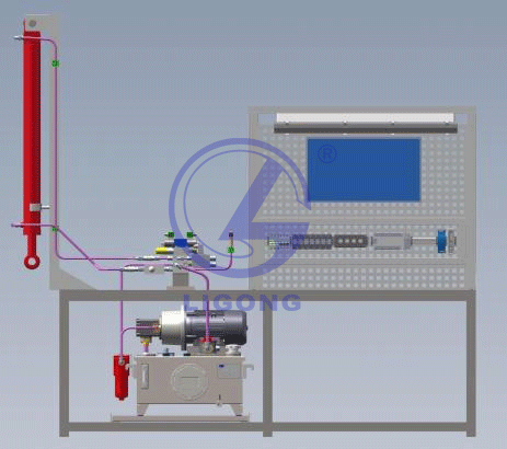 該平臺裝置包括液壓泵站及管路、閥組、油缸和電氣控制及操作臺及模擬裝置, 可通過觸摸屏及按鈕操作液壓系統(tǒng)中油缸的動作,具有超壓、失壓保護及報警提示,系統(tǒng)壓力可調(diào)、執(zhí)行機構(gòu)動作速度可調(diào)及到位停機控制,壓力、行程、液位顯示功 能,參賽選手利用該操作平臺進行液壓啟閉機調(diào)試及故障診斷。