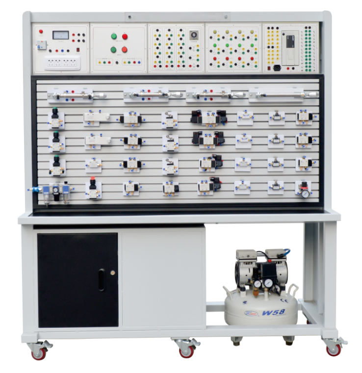 本實(shí)訓(xùn)裝備,由氣動(dòng)元件部分、電氣控制部分及實(shí)訓(xùn)臺(tái)架等組成,電氣部分主要由PLC模塊、繼電器模塊、電源模塊、按鈕模塊等部分組成。實(shí)訓(xùn)臺(tái)主體框架采用鋁木結(jié)構(gòu)組裝完成,臺(tái)架重量較輕且安裝了萬(wàn)向輪,可方便實(shí)訓(xùn)臺(tái)的移動(dòng)。臺(tái)架分上下兩層結(jié)構(gòu),上面可放置電氣模塊,下面是實(shí)訓(xùn)屏,實(shí)訓(xùn)屏采用帶槽鋁合金結(jié)構(gòu),方便各氣動(dòng)元件的安裝和拆卸,學(xué)生可以根據(jù)實(shí)驗(yàn)需要在實(shí)訓(xùn)屏上任意搭建氣動(dòng)回路,組成具有一定功能的氣動(dòng)系統(tǒng)。實(shí)訓(xùn)臺(tái)采用模塊式結(jié)構(gòu),便于組合與擴(kuò)展,提高了設(shè)備空間的利用率。