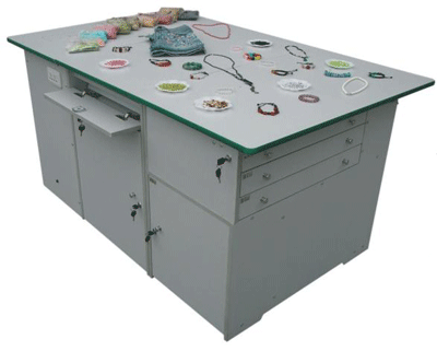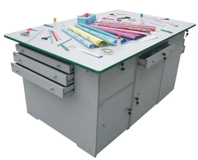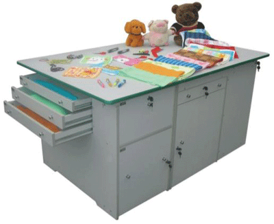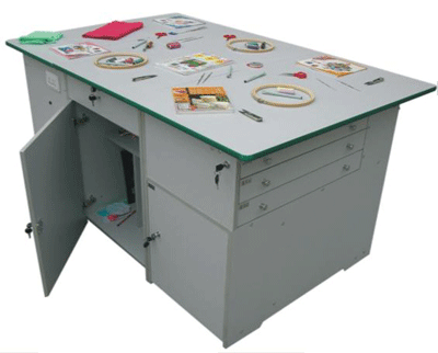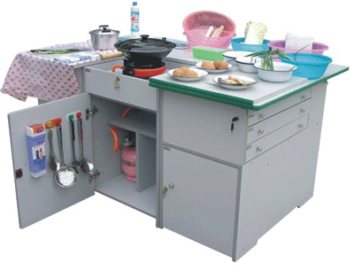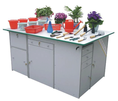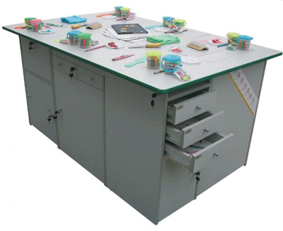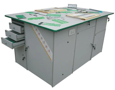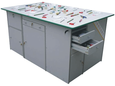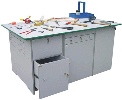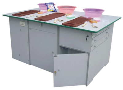 功能:桌體材料選用16mm厚優(yōu)質雙貼面三聚氰胺板和30mm×30mm角鋼組成,桌體板截面選用優(yōu)質PVC封邊經全自動封邊機加溫180攝氏度膠封。桌面材料選用(A型)18mm厚優(yōu)質雙貼面三聚氰胺板或(B型)25mm后成型防火貼面密度板,桌面板截面選用綠色T型PVC封邊槽封。桌體設計由三獨立單元組合在一起,例如金工、木工、洗滌為A獨立單元,烹飪、電工與電子為B獨立單元,縫紉與裁剪、手工工藝為C獨立單元。如果A獨立單元或B獨立單元單獨操作時,桌面可翻轉自如,而且各獨立單元的配備都儲放在各自獨立單元桌體里面。