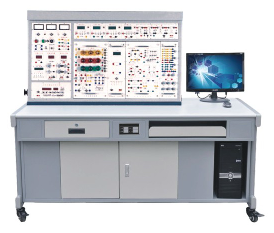 實驗桌為鐵質雙層亞光密紋噴塑結構,桌面為防火、防水、耐磨高密度板;左右設有兩個大抽屜(帶鎖),用于放置工具及資料。右邊設有放置示波器用的可拆卸擱板。
